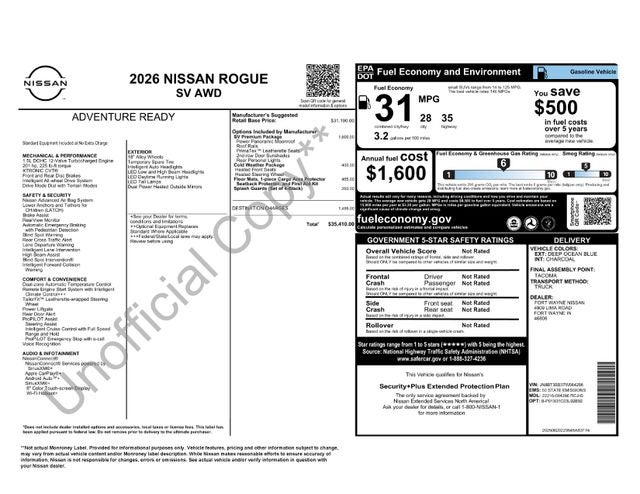 2026 Nissan Rogue SV This Rogue SV vehicle features: Cold Weather Package (Heated Front Seats), SV Premium Package (Leatherette Door Trim Inserts with Stitch, Panoramic Moonroof, Prima-Tex Leatherette Seat Trim, Rear Door Sunshades, Rear Personal Lights, and Silver Painted Roof Rails), AWD, 4-Wheel Disc Brakes, 6 Speakers, ABS brakes, Air Conditioning, Alloy wheels, AM/FM radio: Sirius, Apple CarPlay/Android Auto, Auto High-beam Headlights, Automatic temperature control, Black Splash Guards (set of 4), Brake assist, Bumpers: body-color, Cloth Seat Trim with Patterned Inserts, Delay-off headlights, Driver door bin, Driver vanity mirror, Dual front impact airbags, Dual front side impact airbags, Electronic Stability Control, Emergency communication system: NissanConnect Services, Floor Mats with 1-Piece Cargo Area Protector, Four wheel independent suspension, Front anti-roll bar, Front Bucket Seats, Front Center Armrest, Front dual zone A/C, Front reading lights, Fully automatic headlights, Heated door mirrors, Illuminated entry, Knee airbag, Low tire pressure warning, Occupant sensing airbag, Outside temperature display, Overhead airbag, Overhead console, Panic alarm, Passenger door bin, Passenger vanity mirror, Power driver seat, Power Liftgate, Power steering, Power windows, Radio data system, Radio: AM/FM NissanConnect, Rear anti-roll bar, Rear seat center armrest, Rear side impact airbag, Rear window defroster, Rear window wiper, Remote keyless entry, Speed control, Speed-sensing steering, Speed-Sensitive Wipers, Split folding rear seat, Spoiler, Steering wheel mounted audio controls, Tachometer, Telescoping steering wheel, Tilt steering wheel, Traction control, Trip computer, Variably intermittent wipers, wer door mirrors, and Wheels: 18 Dark Painted Machine Finished Alloy. AWD. 28/35 City/Highway MPG Price includes: $3500 - Nissan Customer Cash. Exp. 03/31/2026